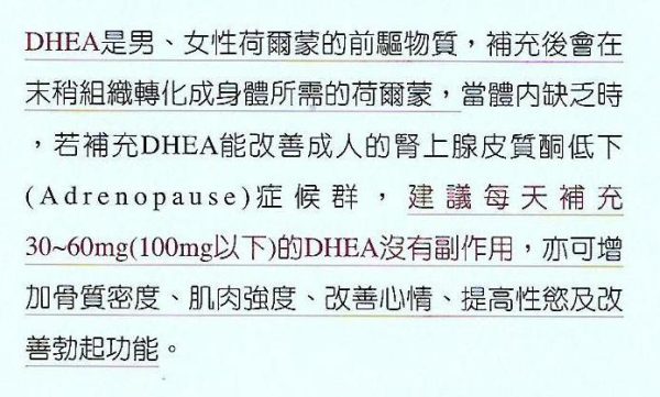 研究建議每天補充30-60mg (100mg以下)的DHEA 是安全的